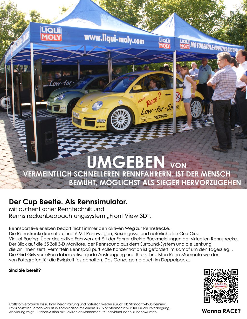 Um die Rennfahrzeuge auch Outdoor zu präsentieren stehen stets Pavillons zur Verfügung. Diese schützen vor starker Sonneneinstrahlung und auch vor Regen. Gegen starken Wind in Verbindung mit sintflutartigen Regenfällen sind diese jedoch machtlos. Wir bestellen deshalb stets bestes Wetter für Ihren Event!